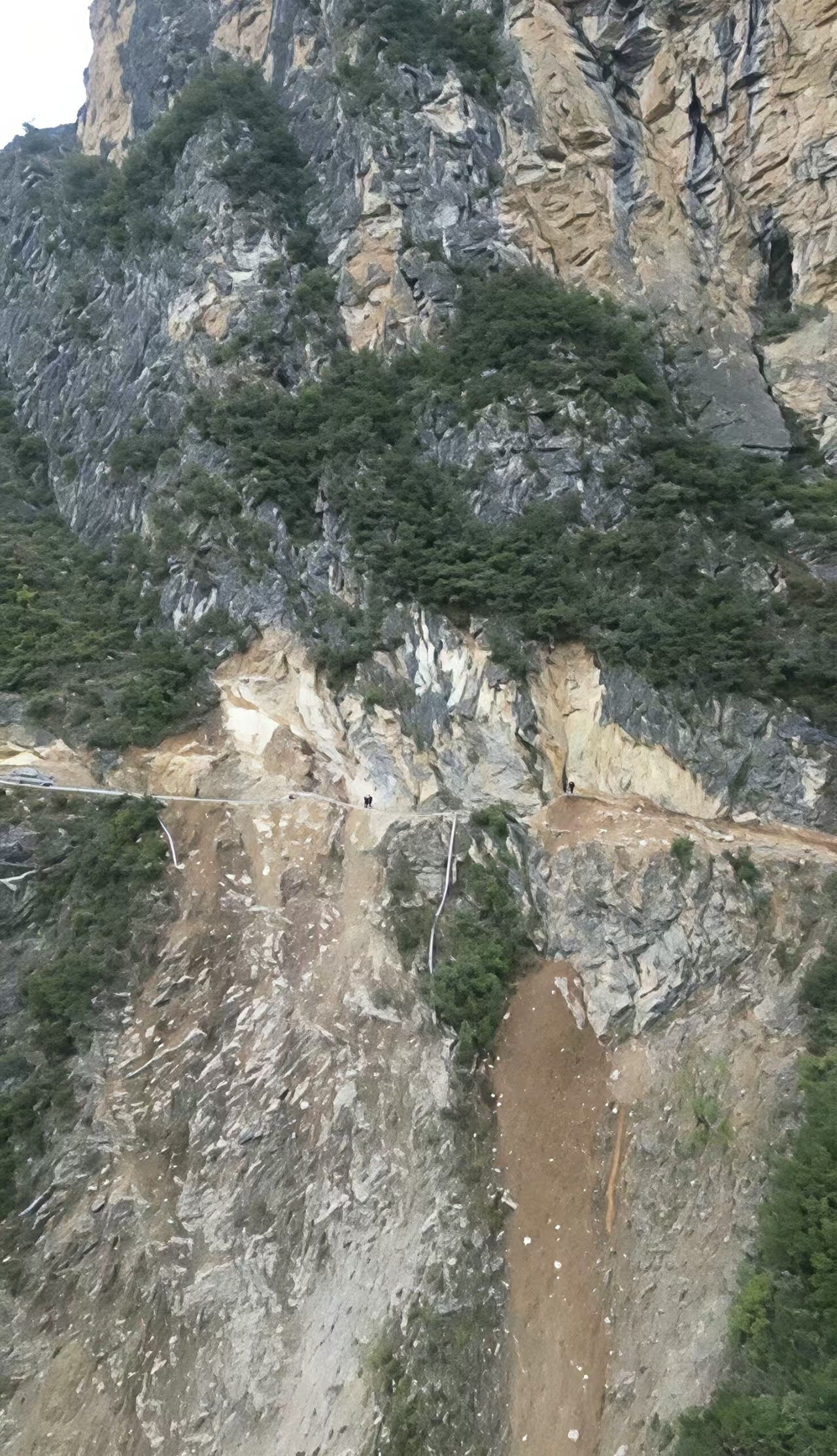 曹福刚表示:“因为路下面是悬崖,上面也是悬崖,垮了以后坡有点陡,基本上坡都在70°以上,峡谷也非常深。当时定的方案就是先排危。垮塌以后,上面还一直往下落石头,因为机器目前上不去,只能让工人拴上安全绳进行人工排危。而且排危只是第一步,这个期间又在下雨,每次我们只有在保证实施工程人员安全的情况下,才能派人员上去排危,把一块块石头弄下来。”