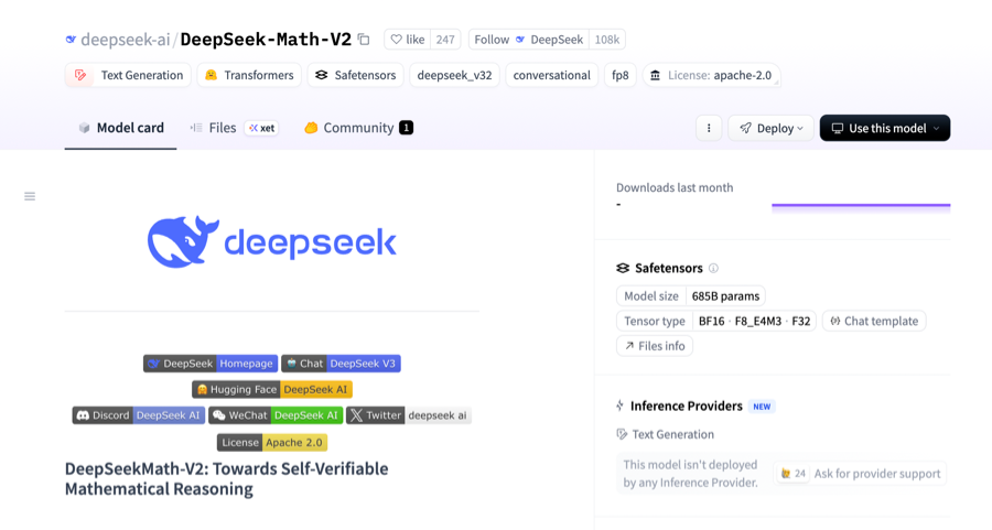 11月27日,DeepSeek在HuggingFace推出新型数学推理模型DeepSeekMath-V2,采用可自我验证的训练框架。该模型基于DeepSeek-V3.2-Exp-Base构建,通过LLM验证器自动审查生成的数学证明,并利用高难度样本持续优化性能。在2025年国际数学奥林匹克竞赛(IMO 2025)和2024年中国数学奥林匹克竞赛(CMO 2024)中均达到金牌水平,并在2024年普特南数学竞赛(Putnam 2024)中取得118/120(近乎满分)的优异成绩。团队表示,该成果验证了自验证推理路径的可行性,为构建可靠数学智能系统提供新方向。模型代码与权重已开源,发布于Hugging Face及GitHub平台。