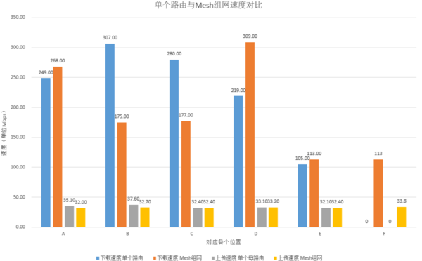 SPeedtest速度方面,在A点,不管是单个路由还是Mesh组网网络,上行和下行均达到了满速状态;B点和C点单个路由上下行依旧在满速状态,但是Mesh组网网络的下行有了小幅度的下降,原因更多的是因为信号发射功率下降从而导致信号强度下降,最终导致下行速度有所下降;在E点,测试终端的信号自动切换到副路由上,所以信号强度大幅度提升,测速也达到了满速状态;在E点,测试终端的信号也自动切换到了Mesh Poin身上,信号强度很强,但是速度却没有明显的提升,从这里可以感受到双频无线回程对网络的影响程度;在F点,下行速率为113Mbps,尽管有接近一半的衰减,但是正常的看视频刷网页完全不影响。